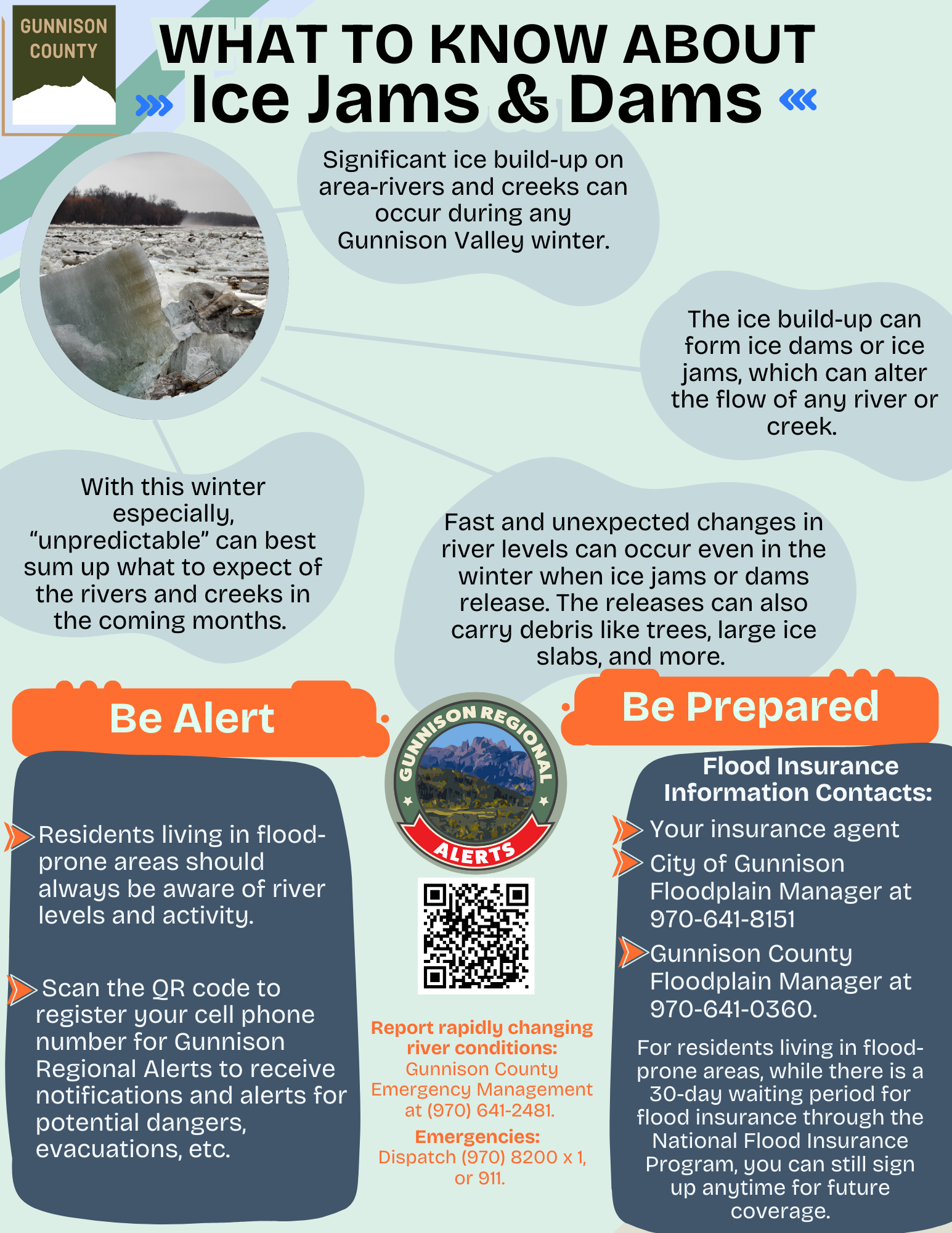 The Gunnison Valley has experienced prolonged cold and subzero temperatures more this winter compared to last winter. This type of weather can lead to an increase in the occurrence of ice dams and jams. On January 23rd, there were reports of an ice dam affecting some residences. Read the news release below for more information and check out the infographic about ice jams and dams.